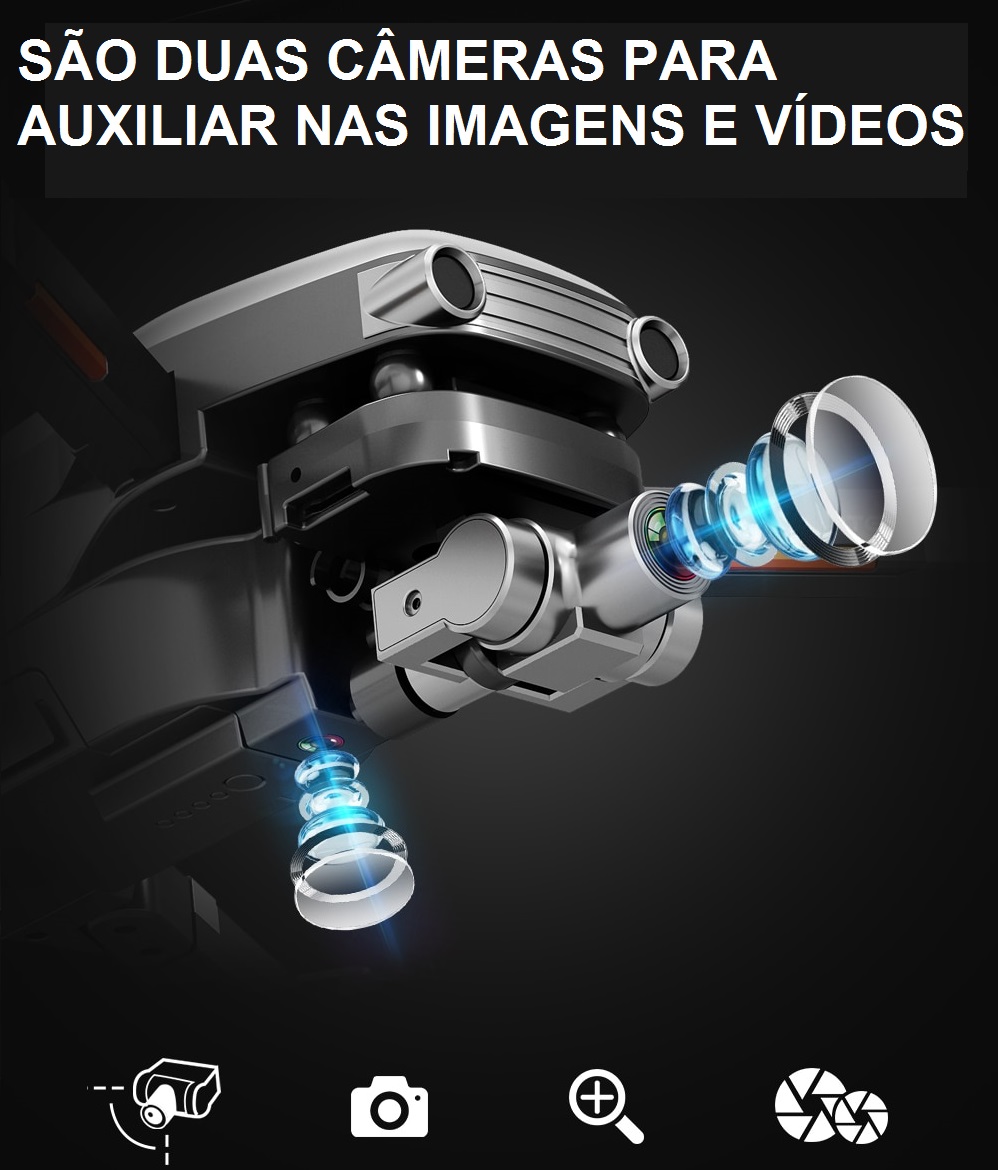- Câmera: dois eixos mecanial estabilizando cardan (Gimbal).